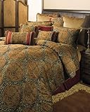 Loose yourself in this dramatic medallion, trimmed with animal spin. It adds strength and a modern twist to the opulence of this design. 1pc. Comforter 92x96, 2 pcs.- 20x26 Standard Shams, 1pc. - 60x80x15 Bedskirt Update your bedroom with a new elegant and stylish comforter set. Comforter Set features a dramatic mix of damask and leopard spots It includes oversized comforter, tailored beskirt, 2 shams. 100% Polyester